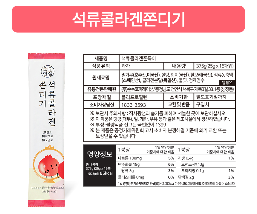 [순수한집] 저칼로리 쫀드기 랭킹 1위 석류콜라겐 쫀드기 (25g x 15개입)